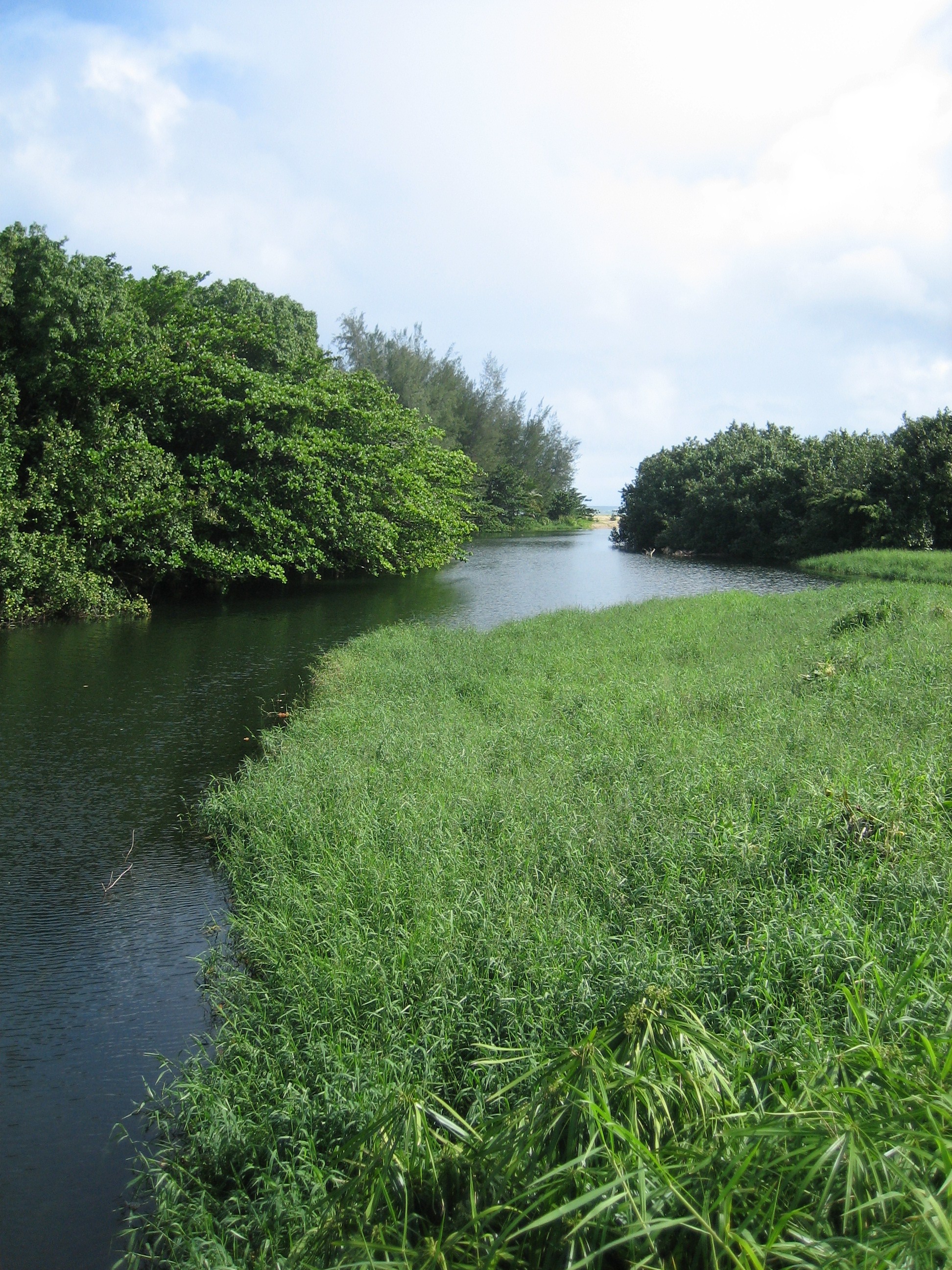 ボーンを求めて旅行2日目。前回お世話になったガイドとスケジュールが合わないために日帰りで一度行ってみたかったカウアイ島へ。もちろんフライロッド抱えてである。1995年に出た船井幸雄とテラウチマサトの「癒しの島々」という本をみて今年の正月明けに宮古島へ赴き思い切り泡盛で癒された?のをいいことに、カウアイ島も足を伸ばしてみることにする。以前友達になった兄弟の実家があるはずで音信不通になっているので探してみたいというのと、もしボーンがつれるようなフラットがあれば開拓してやろうという二本立ての動機があった。