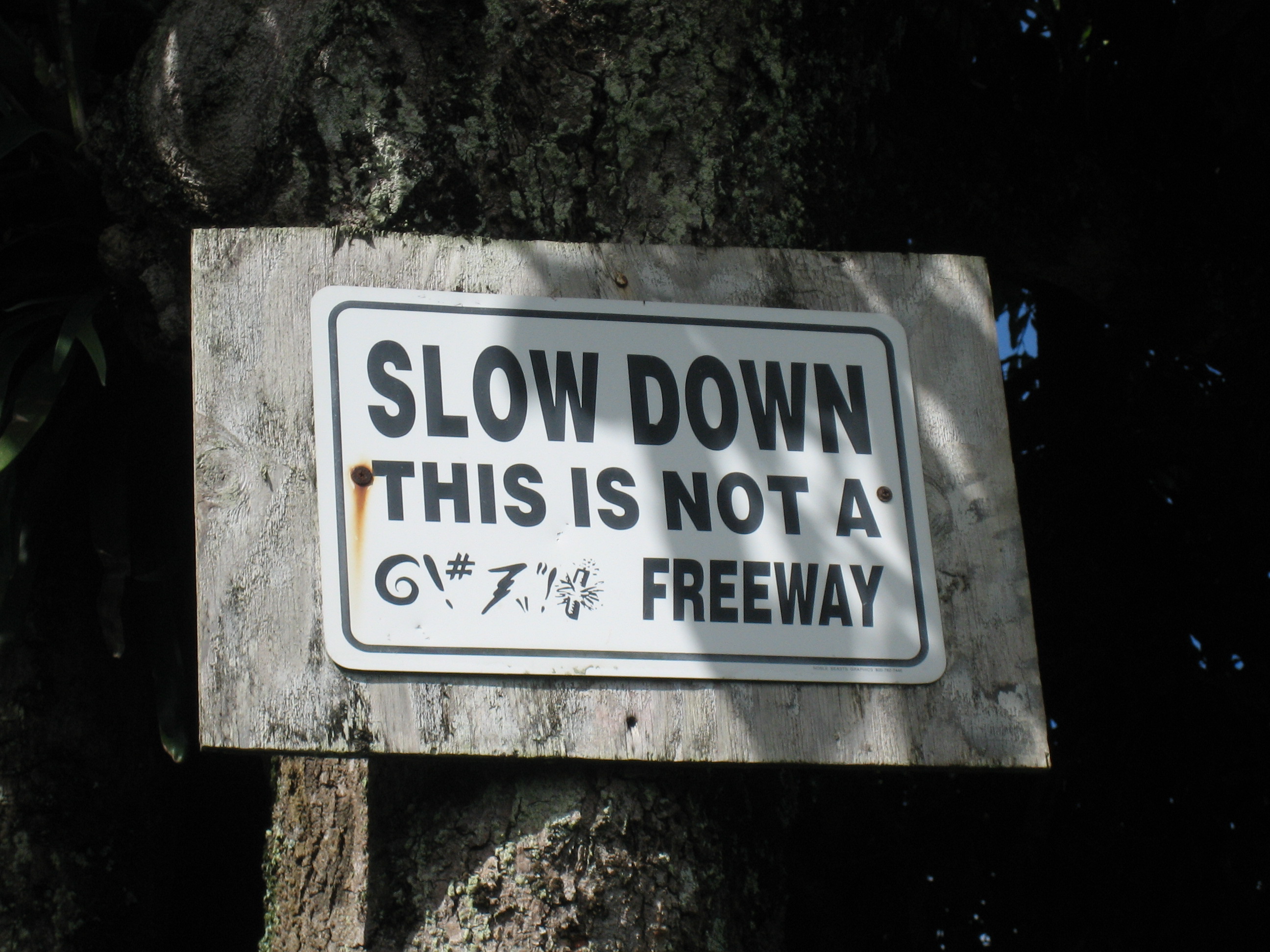 すると池のほとりにこんな看板が。もちろん車に対してだけれども私にも「ガツガツしなさんな」っていっているようにみえてくる。