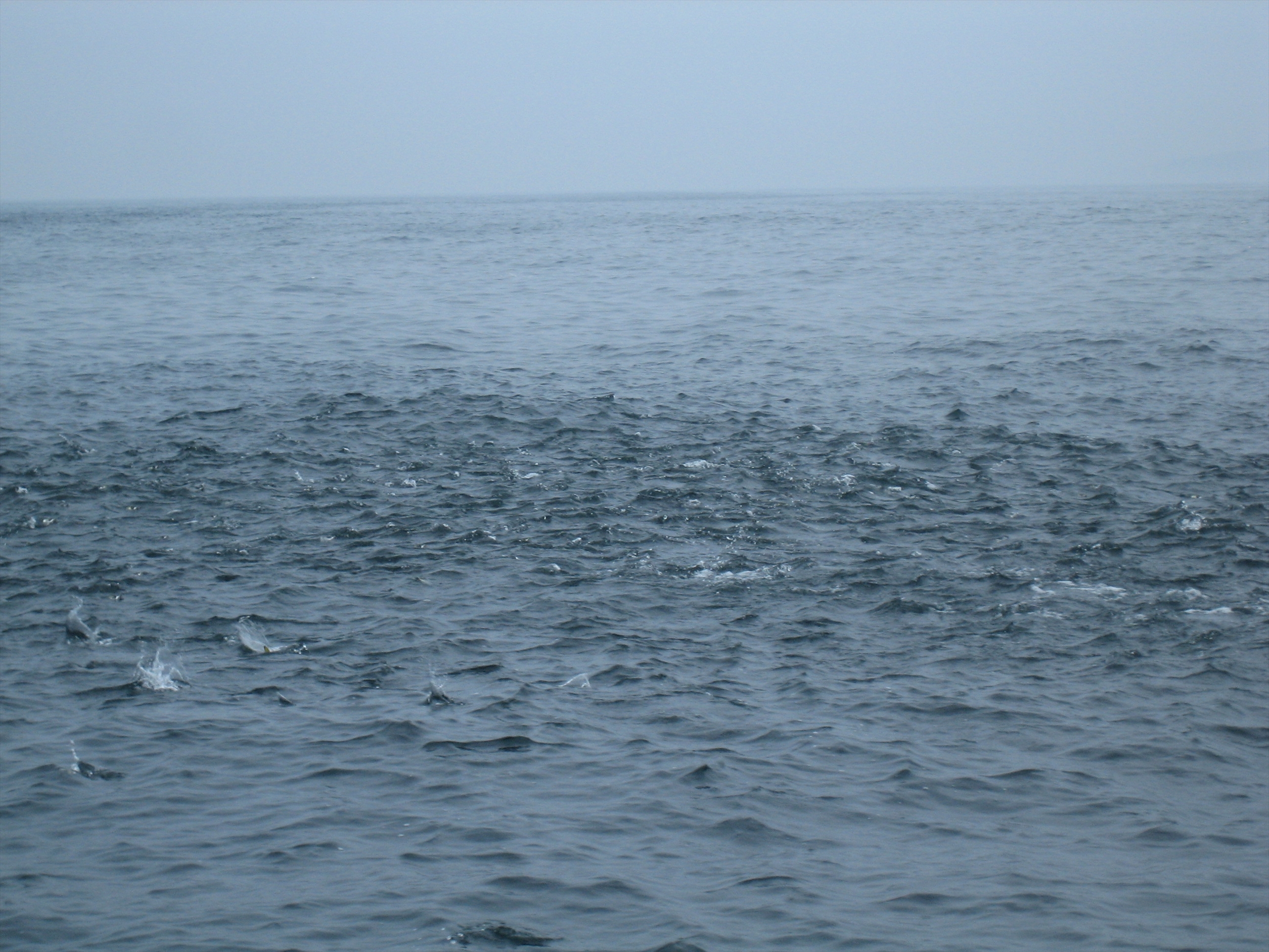 大貫沖だろうか、コサバが群れでで顔を上げて泳いでる。25cmくらいでまだ単独にバラけるまでは少しかかるかんじで鳥が食うには大きすぎ、イワシと比べるとおいしくないからか、上下からの攻撃は皆無。ベイトを追いかけるでもなくただ顔上げてみんなで仲良く更新しているかんじ、結構広範囲でこの風景があった。