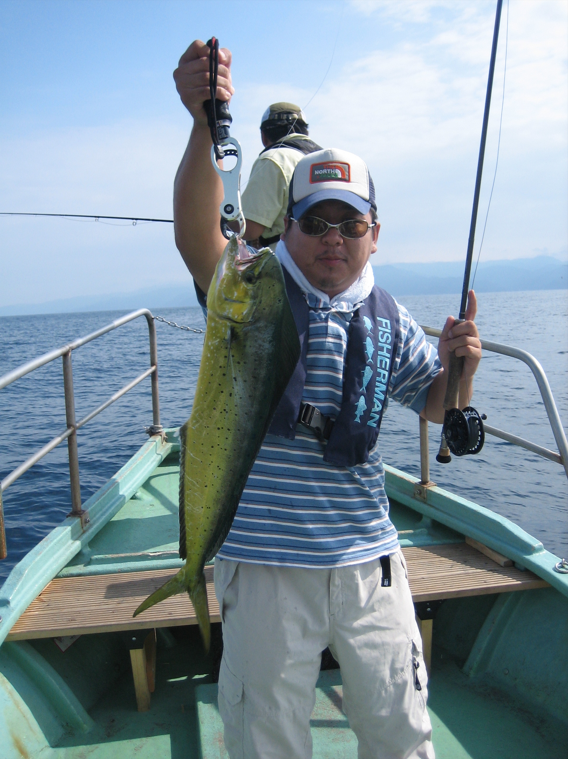 さすがはすれてない連中らしく、わんさかやる気いっぱいのシイラがでてくる!僕のルアーは一発目でラインブレイクしてしまった、、、ダークO氏の愛のこもった怒声の指導に従い ノンタンさんシイラゲット!その後、駿河湾では数少ない浮標に向かって6,7艇が ルアーうっている、たたかれつくしているポイントでもフライでペンペンだけどトロフィーをえる。やったねノンタンさん!!