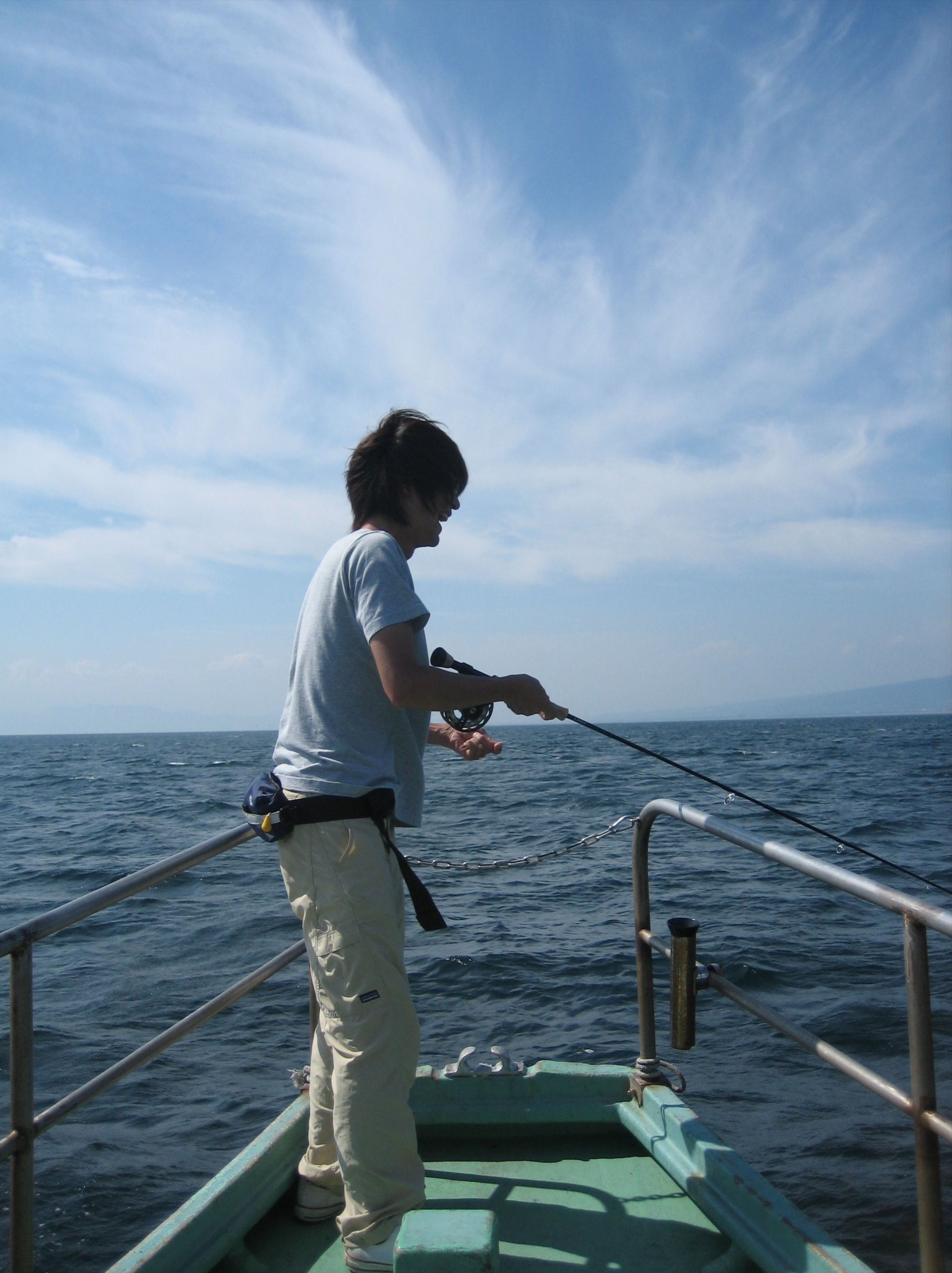 港を出て10分ほど走って鳥山発見!先週よりやや神経質で鳥山がたっていないナブラが多く、 鳥山といっても2,3羽さしているだけで、ほとんどナブラを追うことになった。この船長さんフライの操船とてもうまく、フライの距離を考えてもらえるのがありがたい。先週港目前にして思わぬハプニングで乗船できなかったシノラーはやる気満々。ナブラは足が速いものの数があるので苦労しない。