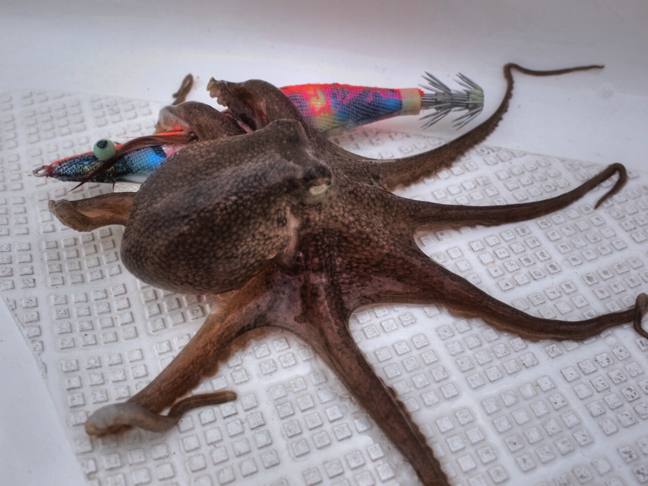 何とか今シーズンお初のスミイカにはお目にかかれましたが、このミニタコの写真で精いっぱい。墨の処理に追われたのと、、、