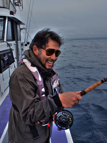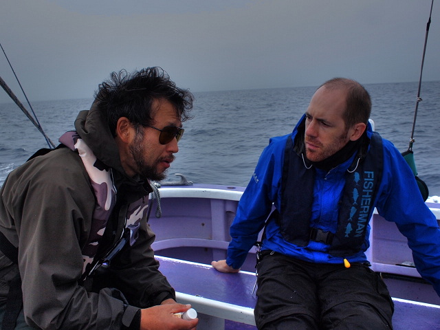 熱く、今年ルアー参戦したAndyにたいして、「フライフィッシングは楽しいからぜひやろう、来年はやっぱり18番ロッド買って、一緒にどうだ?」って口説いています(たぶん)。