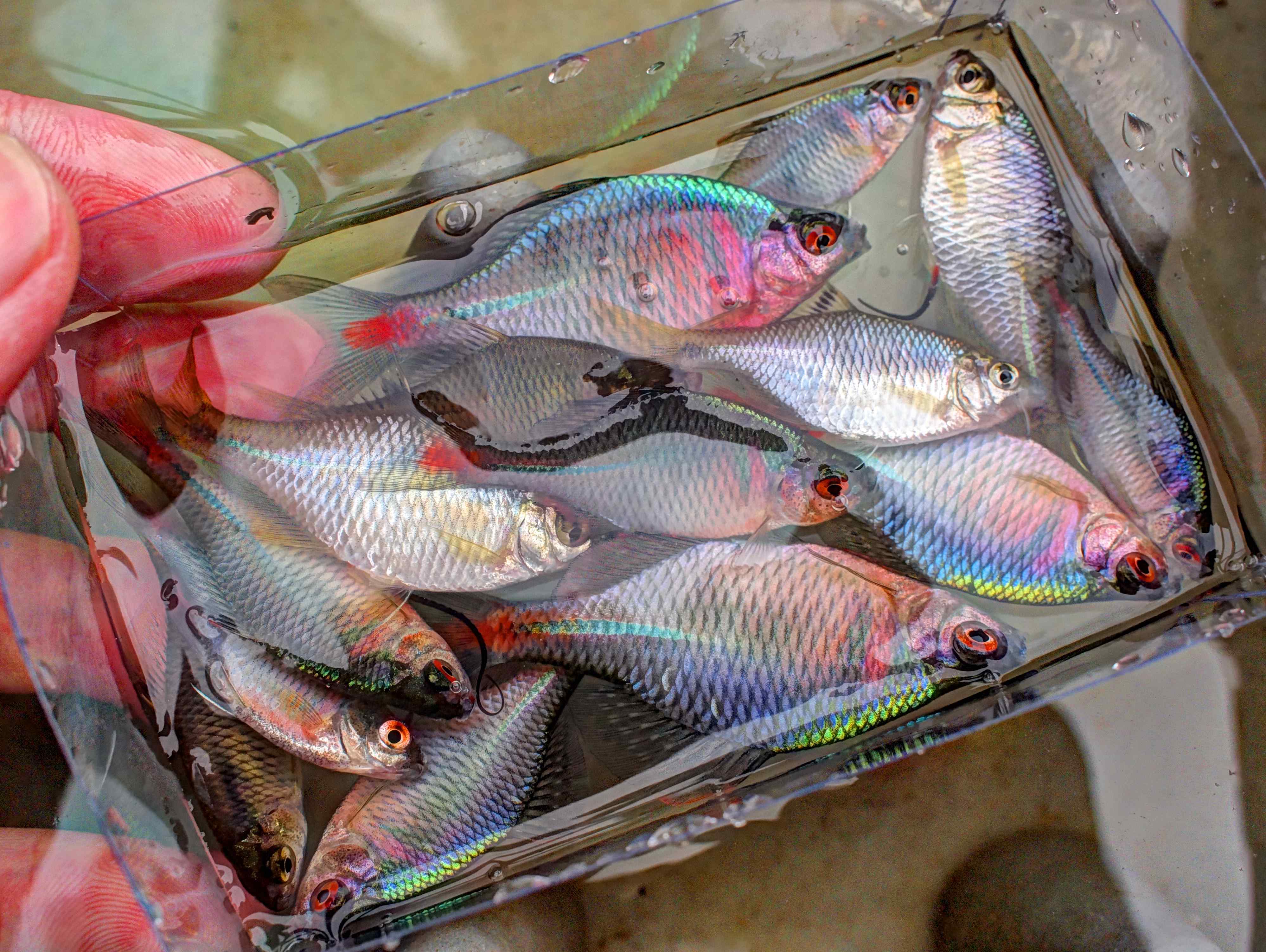 ニジカワムツの美しいと思える時は限られていて成魚になりたての15cm前後に一瞬見せるなんとも言えない美しさというのもあるけれど、ターポンとバラタナゴの前には霞んでしまう。